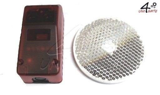 Fotobuňka s odrazkou 12 - 24V, extérní, do 15m. Jednoduché zapojení. Předností tohoto systému je přijímač a vysílač v jednotném systému a kotvení odrazky na druhé straně průjezdu bez nutnosti kabeláže.