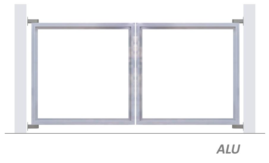Dvoukřídlá otočná brána, jeklový hliníkový (ALU) profil, pro vlastní dodatečnou výplň, varianta bez sloupků vč. modulovaných pantů s velkou základnou. Boční doraz, bez zámku.