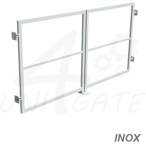Dvoukřídlá otočná brána, jeklový nerezový (INOX) profil, pro vlastní dodatečnou výplň, varianta bez nosných sloupů vč. regulovatelných pantů. Spodní doraz, bez zámku.