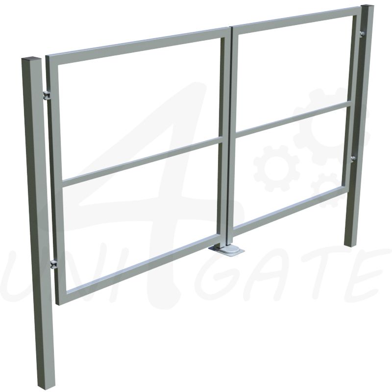 Dvoukřídlá otočná brána, jeklový pozinkovaný profil, pro vlastní dodatečnou výplň, varianta s nosnými sloupy vč. regulovatelných pantů. Spodní doraz, bez zámku.
