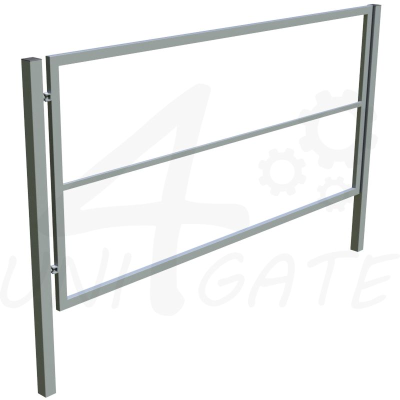 Jednokřídlá otočná brána, jeklový pozinkovaný profil, pro vlastní dodatečnou výplň, varianta s nosným a dorazovým sloupem vč. regulovatelných pantů. Boční doraz, bez zámku.