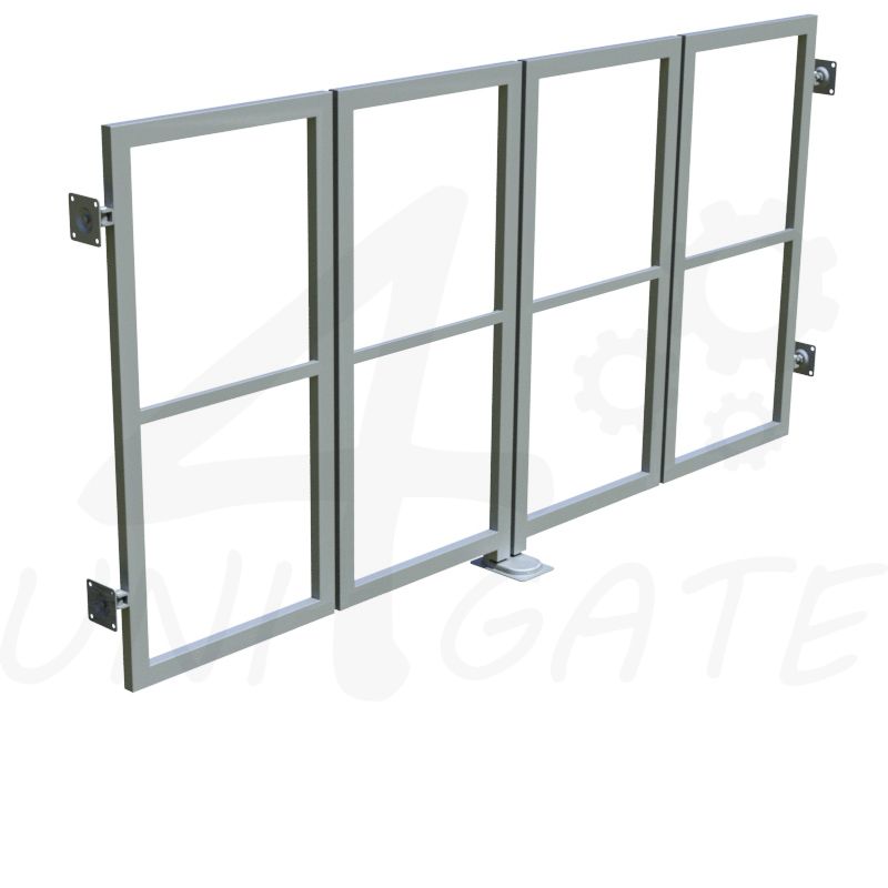 Dvoukřídlá otočná brána skládací, jeklový pozinkovaný profil, pro vlastní dodatečnou výplň, varianta bez nosných sloupů vč. regulovatelných pantů. Spodní doraz, bez zámku.