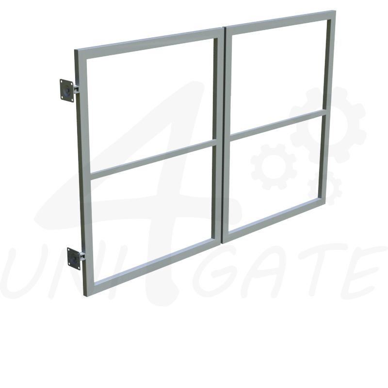 Jednokřídlá otočná brána skládací, jeklový pozinkovaný profil, pro vlastní dodatečnou výplň, varianta bez nosných sloupů vč. regulovatelných pantů. Spodní doraz, bez zámku.