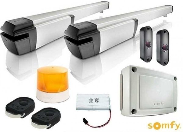 Sada IXENGO io KOMFORT, pohony křídlových bran pro ovládání mobilem - set 2ks masivních pohonů Somfy pro dvě křídla vč.nastavitelných magnetických dorazů na pohonu, do 800kg váhy, průjezdová světlost do 8m, 24V, vč. řídící elektroniky, páru fotobuněk, majáku, záložního zdroje, přijímače a 2ks vysílače Keygo io.
