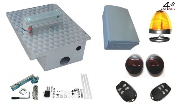 S-FIT180/1 Pohon jednokřídlé brány - podzemní - NEREZ, set 1ks FIT s řetězem pro otevření o 180°, box NEREZ, průjezdová světlost do 2m a max. hmotnost křídla 200 kg, vč. elektroniky C22, páru fotobuněk RS15, majáku SP, přijímače a 2ks kvalitních KOVOVÝCH vysílačů TXQ + 1ks ZDARMA