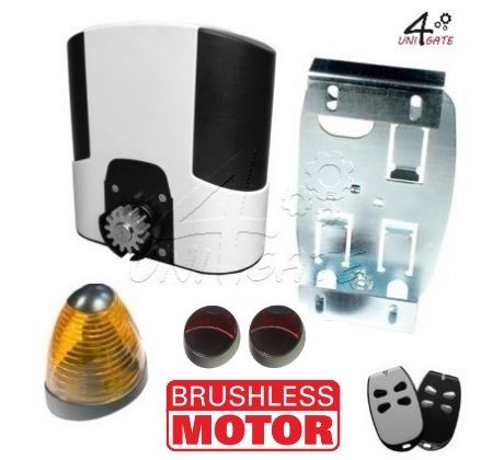Pohon posuvných bran, 24V, do 1000kg s BRUSHLES DC motorem, magnetický koncový spínač a snímač nárazu na překážku, základová deska, ovládací elektronika C64, přijímač SX a 2ks vysílače TX Q, pár fotobuněk RS15, maják SP12 s LED žárovkou, přijímač SX a 2ks vysílače TX Q