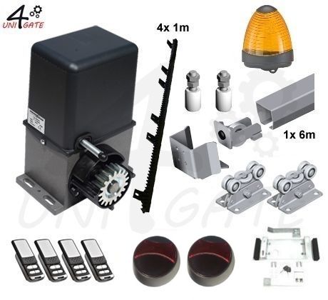 S-PL ECO TN Sestava komplet: pohon posuvných bran, 4m nylonové ozubené tyče a samonosného systému do 4m průjezdu a 300kg, vč. veškerého příslušenství + 2ks vysílače zdarma