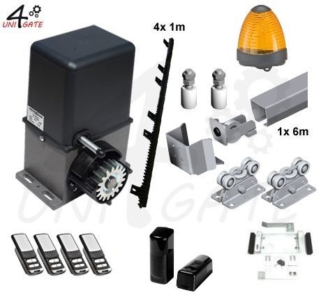S-PL 5 TN Pohon na pojezdové brány - set PULS 5, do 500kg, mechanický koncový spínač, 230V, vč. základové desky, 4m nylonové ozubené tyče, ovládací elektroniky P100, páru fotobuněk RS18, majáku SP 230 LED, přijímače a 2ks vysílače TXM G+ 2ks zdarma, nosníku N70 (60x70x6000mm), 2x pětikolového vozíku VO70, víka VI70, víka s kolem VK70, kapsy KP70 a 2ks rolny o průměru 25mm.