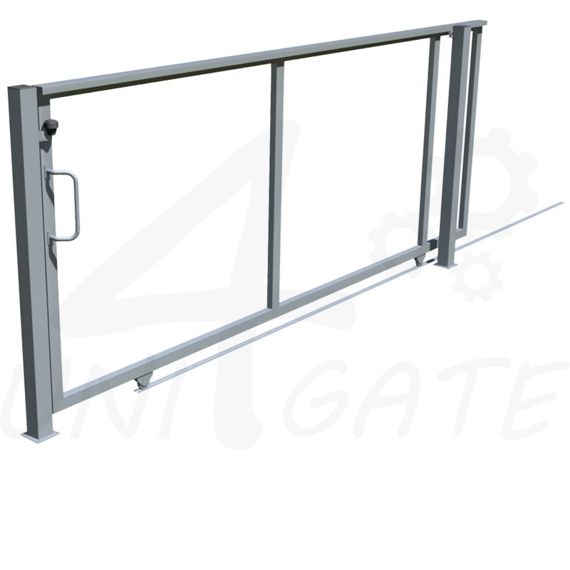 Posuvná brána vč. sloupků, jeklový pozinkovaný profil, pro vlastní dodatečnou výplň. Vodící sloupek horního vedení a dojezdový sloupek jsou součástí. Kolejnice vč.ložiskových vodících kol a veškerého příslušenství. Možnost osazení automatickým pohonem.
