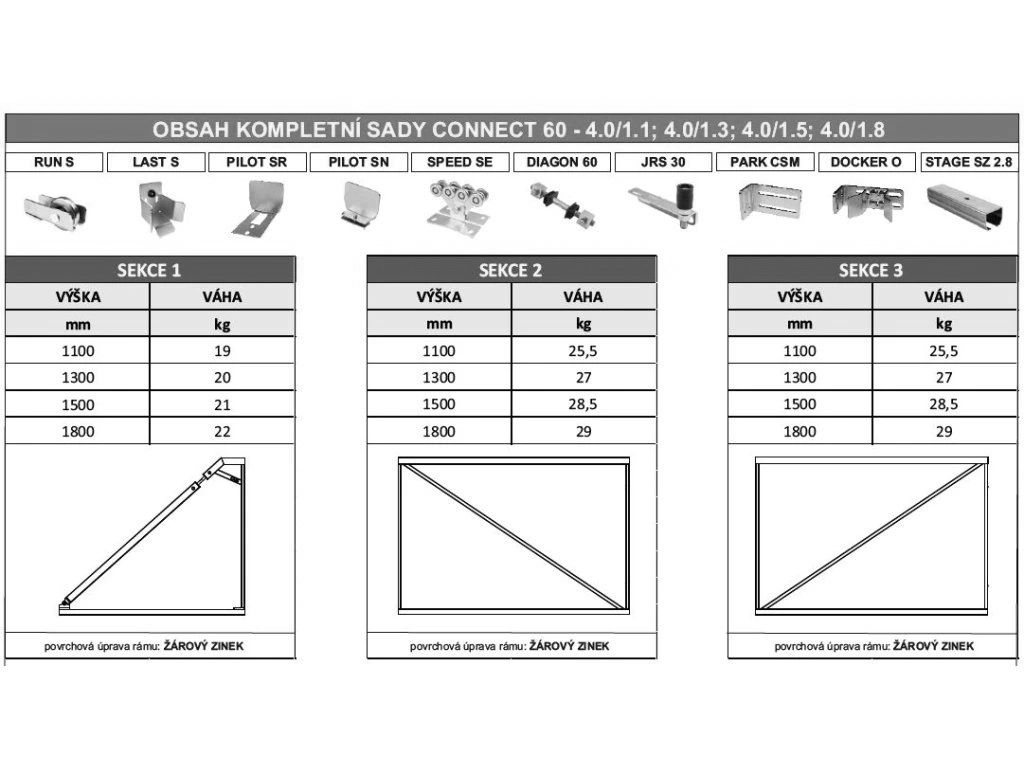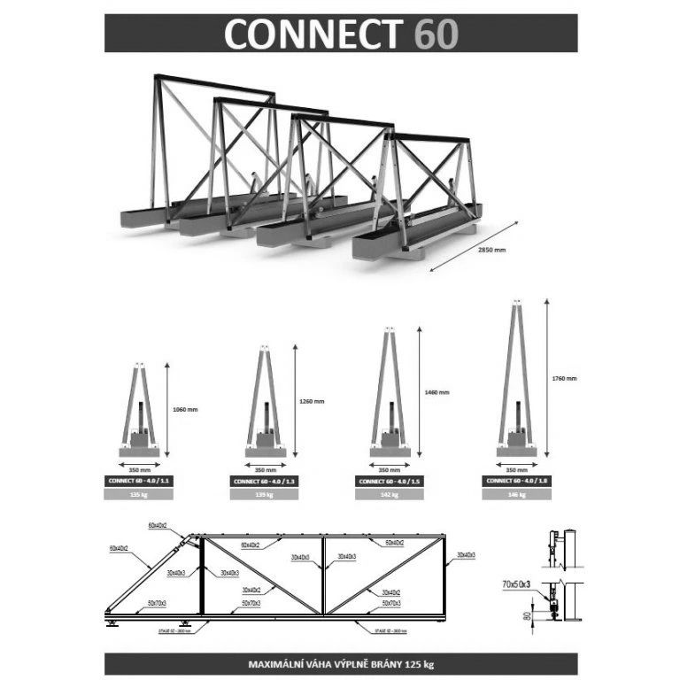 Brána Connect 60 pouze pro vlastní dodatečnou výplň. Max. šířka průjezdu 4m, celková délka a nutný prostor pro výsuv 5,6m. Bez vodícího a dojezdového sloupku. Dodáváno na paletě ze tří sekcí a komponentů pro kompletaci šroubováním.