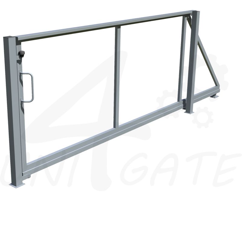 Posuvná samonosná brána vč. sloupků, jeklový pozinkovaný profil, pro vlastní dodatečnou výplň, varianta bez a také s kotvící základnou. Vodící sloupek horního vedení a dojezdový sloupek jsou součástí. Nosný profil vč.ložiskových vozíků a veškerého příslušenství. Možnost osazení automatickým pohonem.