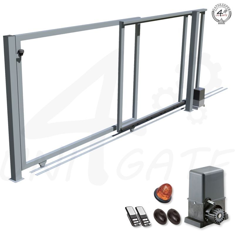 KOMPLET posuvná teleskopická brána pojezdová po kolejnici vč. sloupků, dvoudílná vč. automatizace. Jeklový pozinkovaný profil, pro vlastní dodatečnou výplň. Vhodná všude tam, kde je málo prostoru pro zasunutí (např. pro 4m průjezd je dostačující 2,5m místa pro výsuv). Vodící kola vč. kolejnice k našroubování a veškerého příslušenství. VODÍCÍ A DOJEZDOVÝ SLOUPEK. Sestava automatického pohonu PULS MAT vč. ozubených tyčí již osazených na konstrukci a vč. veškerého příslušenství
