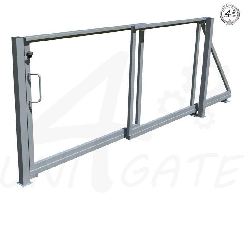 Posuvná teleskopická samonosná brána vč. sloupků, dvoudílná. Jeklový pozinkovaný profil, pro vlastní dodatečnou výplň. Vhodná všude tam, kde je málo prostoru pro zasunutí (např. pro 4m průjezd je dostačující 3,8m místa pro výsuv). VODÍCÍ A DOJEZDOVÝ SLOUPEK.