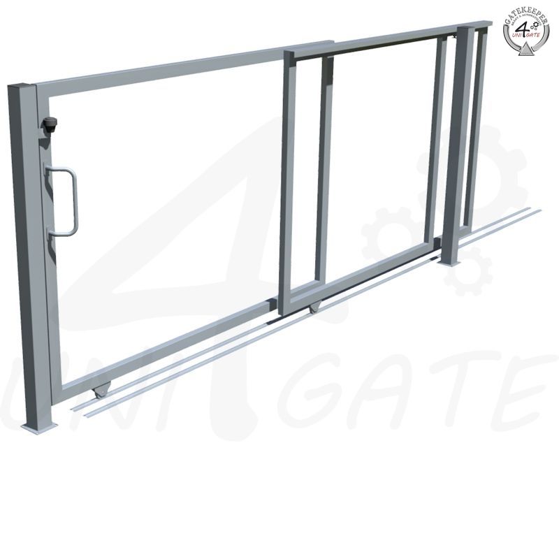 Posuvná teleskopická brána pojezdová po kolejnici vč. sloupků, dvoudílná. Jeklový pozinkovaný profil, pro vlastní dodatečnou výplň. Vhodná všude tam, kde je málo prostoru pro zasunutí (např. pro 4m průjezd je dostačující 2,5m místa pro výsuv). Vodící kola vč. kolejnice k našroubování a veškerého příslušenství. VODÍCÍ A DOJEZDOVÝ SLOUPEK.