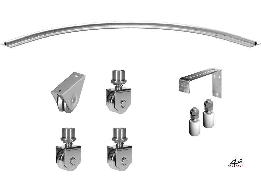 Sestava kování prvního a druhého křídla vč. kolejnice s rádiusem a horního vedení pro výrobu posuvné rohové brány svépomocí.