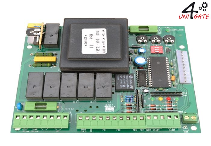 Řídící elektronika UNIVERZÁLNÍ pro dvoukřídlé brány, posuvné brány, závory, aj. Vč. rozvaděče - boxu IP55, 230V, analogová pro 1/2 motory. Nastavení pomocí přepínačů a trimrů. Možnost připojení dalších prvků vč. koncových spínačů.