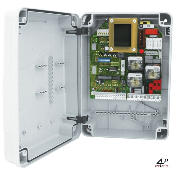Nastavení pomocí trimeru a dip-přepínače: napájení elektrického zámku, možnost připojení externích hodin, elektronická brzda, signalizace stavu automatizace. Automatická kontrola světelných závor (DSA), automatická kontrola bezpečnostních lišt (DACS), možnost připojení semaforu s až třemi světly. Jednofázové a třífázové napájení.