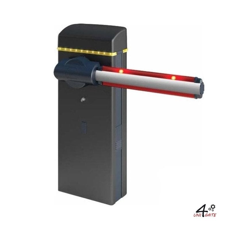 Elektromechanická parkovací závora BFT - BT A 80, 24V, do 8m, 8sec. zdvih, vč. řídící elektroniky, břevna 6m délky a pevné podpěry.